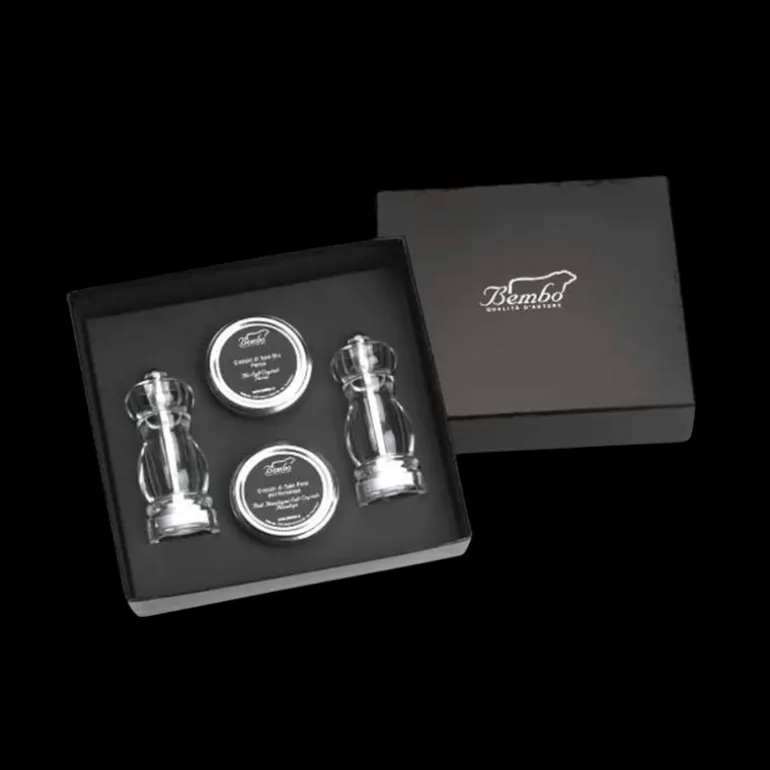 Cofanetto Regalo con due vasetti di sale e due macine per sale con meccanismo in ceramica, adatto al sale in quanto la ceramica non subisce gli effetti ossidanti del sale.