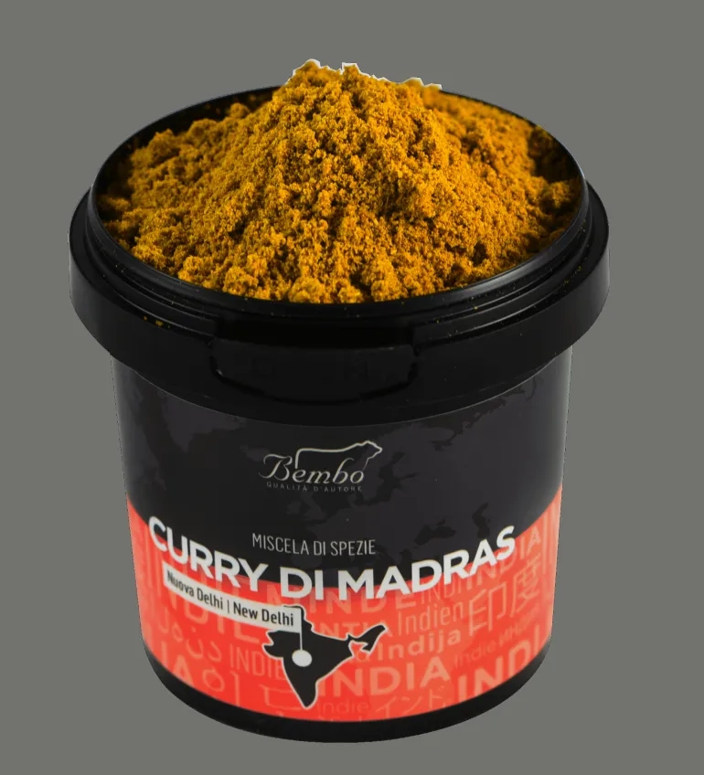 Il Curry di Madras è famoso tanto da essere diventato sinonimo stesso della parola Curry nel mondo. Madras è l’antico nome della città dell’India; È un Curry deciso che, a seconda della quantità di peperoncino, può̀ essere più̀ o meno piccante. Il sapore prevalente è quello della curcuma: secco e avvolgente; Seguono, poi, le note speziate e particolari della senape e del pepe, esaltate dalla leggera affumicatura della paprica. Il cardamomo, con il suo aroma floreale, completa la miscela.
