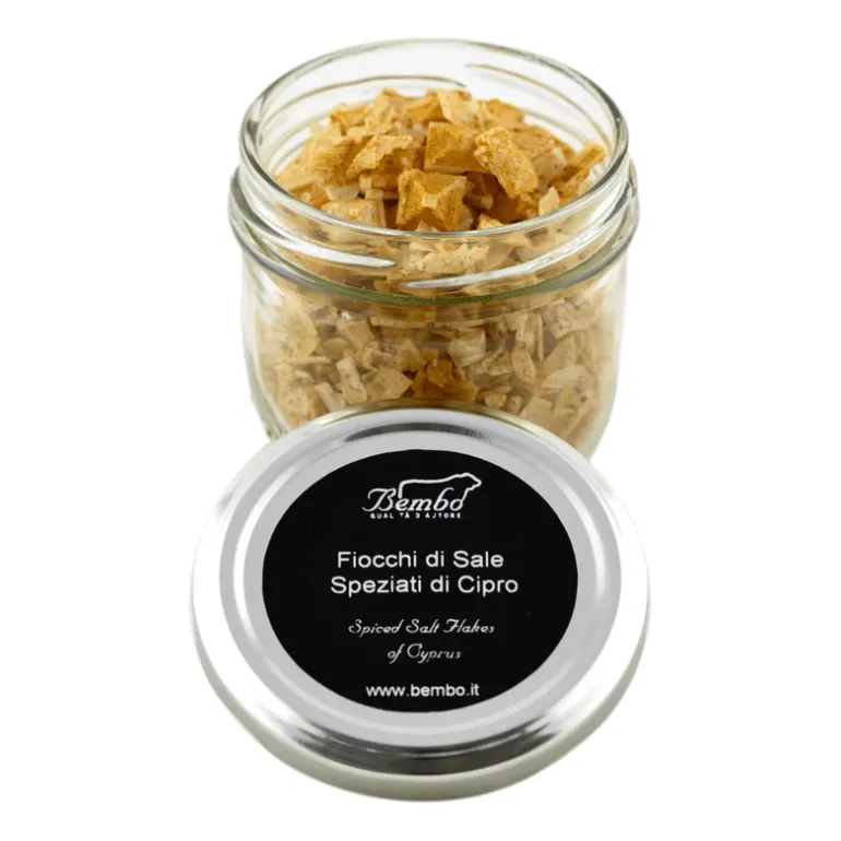Delicati Fiocchi di Sale Marino di Cipro ricoperti da un sottile strato di spezie esotiche: paprika, coriandolo, curcuma, cumino, pepe di Cayenna, noce moscata, zenzero e chiodi di garofano.