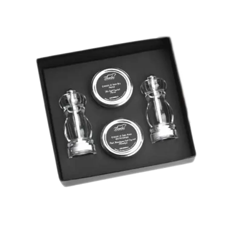 Cofanetto Regalo con due vasetti di sale e due macine per sale con meccanismo in ceramica, adatto al sale in quanto la ceramica non subisce gli effetti ossidanti del sale.
