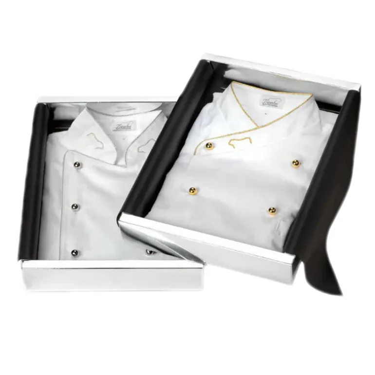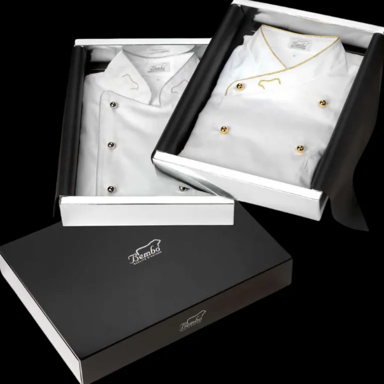 Sempre elegante, anche durante il lavoro in cucina. Bembo non rinuncia allo stile che la contraddistingue e propone una giacca da chef elegante e funzionale, in satin, antimacchia, profilata con filo argentato o dorato. La giacca da chef Bembo è perfetta per chi vuole stupire gli ospiti durante una cena speciale cucinata da un “vero” chef.