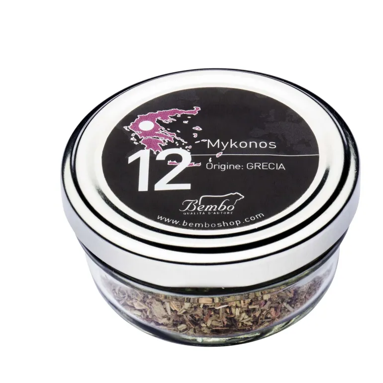 La miscela di erbe Mykonos è stata inventata negli anni ’60. Sembra che uno degli chef dello yacht di Aristotele Onassis, in occasione della prima visita di Jacqueline Kennedy che sarebbe poi diventata moglie dell’armatore greco, preparò questo melange per condire una insalata di carote, cetrioli e pomodori di cui Jacqueline era ghiotta. Gli invitati ne furono così entusiasti che ben presto la ricetta fece il giro del mondo. Questa miscela racchiude in un bouquet aromatico tutti i profumi del mediterraneo. E’ una miscela particolarmente adatta ad insaporire pesci e carni bianche, uova e salse e piatti a base di verdure al vapore e legumi. Ottima anche per marinare carni da cuocere alla griglia.