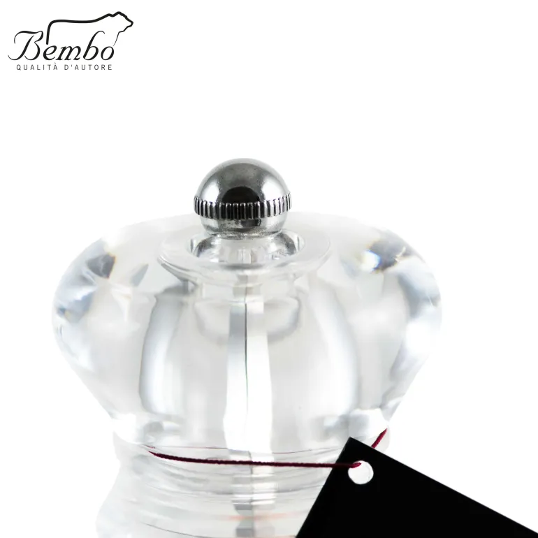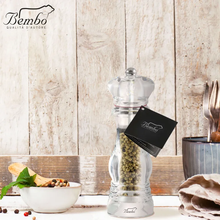 - CARATTERISTICHE E STRUTTURA: la Macina Pepe è alta 21 cm e ha una struttura in Polimero Termoindurito (comunemente utilizzato per uso odontoiatrico) trasparente. Formata da 2 pezzi: il corpo e la testa, uniti da un dispositivo di collegamento diretto alla macina in ceramica regolabile. La Macina Pepe Bembo è molto resistente: Antigraffio, antiossidante, trasparente, elegante, non richiede particolari manutenzioni.