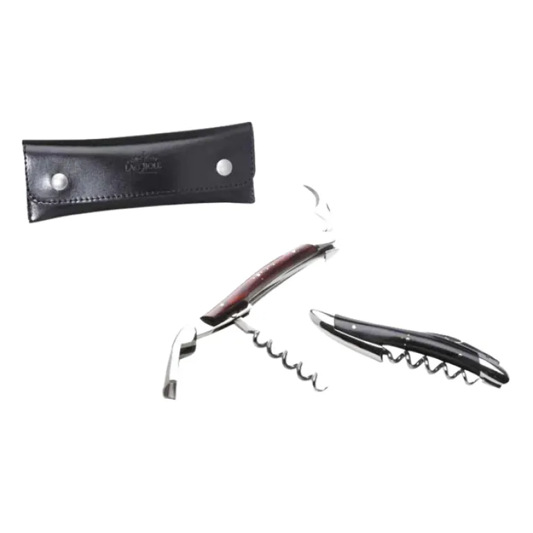 Raffinato set per Sommelier delle forgerie francesi di Laguiole con apribottiglie classico in acciaio inossidabile e manico in stamina nero. 3 funzioni: lama microdentata, cavatappi, apribottiglia.